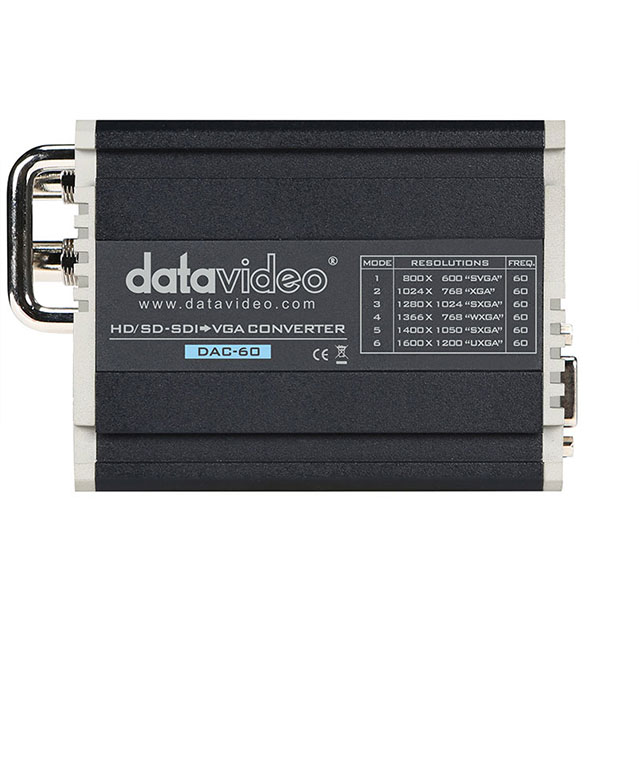 مبدل دیتاویدئو برای ایجاد امکان نمایش سیگنال SDI روی لوازم جانبی مانند پروژکتورها، تلویزیون های پلاسما و نمایشگرهای LCD و نظایر آنها طراحی شده است. مبدل ویدئو DAC-60 با سیگنال های SD PAL, NTSC  و هم چنین سیگنال های HD_SDI و 3G SDI  سازگار است.